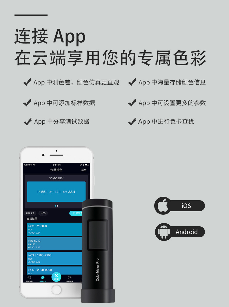 色差寶ColorMeter Pro是一款不同以往的顏色工具,強大的性能配置,讓色彩測量更專業;與安卓或IOS設備無線連接,極大的拓展了顏色測量儀器的應用邊界;它將帶您進入色彩管理新世界,可替代印刷、涂料、紡織等色卡,實現顏色讀取、色卡查找功能。