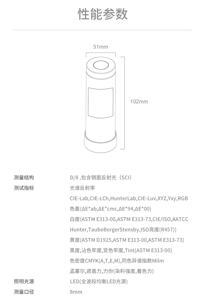 | 測量指標 | CIE-Lab,ΔE*ab,光譜曲線 | 光譜反射率,CIE-Lab,CIE-LCh,HunterLab,CIE-Luv,XYZ,Yxy,RGB 色差(ΔE*ab,ΔE*cmc,ΔE*94,ΔE*00),白度(ASTM E313-00,ASTM E313-73 CIE/ISO,AATCC,Hunter,TaubeBergerStensby),黃度(ASTM D1925, ASTM E313-00,ASTM E313-73)黑度(My,dM),沾色牢度,變色牢度, Tint(ASTME313-00),色密度CMYK(A,T,E,M)同色異譜指數Milm,孟塞爾, 遮蓋力,力份(染料強度,著色力) | |
