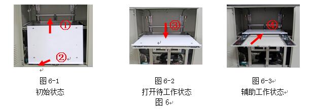 在圖6中的圖6-1初始狀態下,在標志①處整體往上拉,使活動托板的下端往上抬高,同時在②處往外拉,直到活動托板處于水平位置,圖6-2中顯示的③打開待工作狀態。